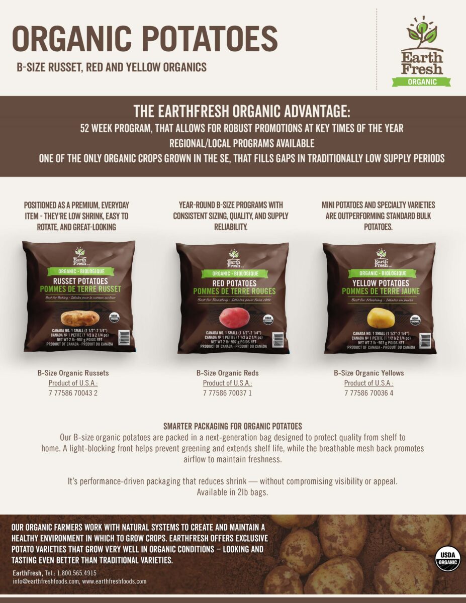 Our B-size organic potatoes are packed in a next-generation bag designed to protect quality from shelf to home. A light-blocking front helps prevent greening and extends shelf life, while the breathable mesh back promotes airflow to maintain freshness.