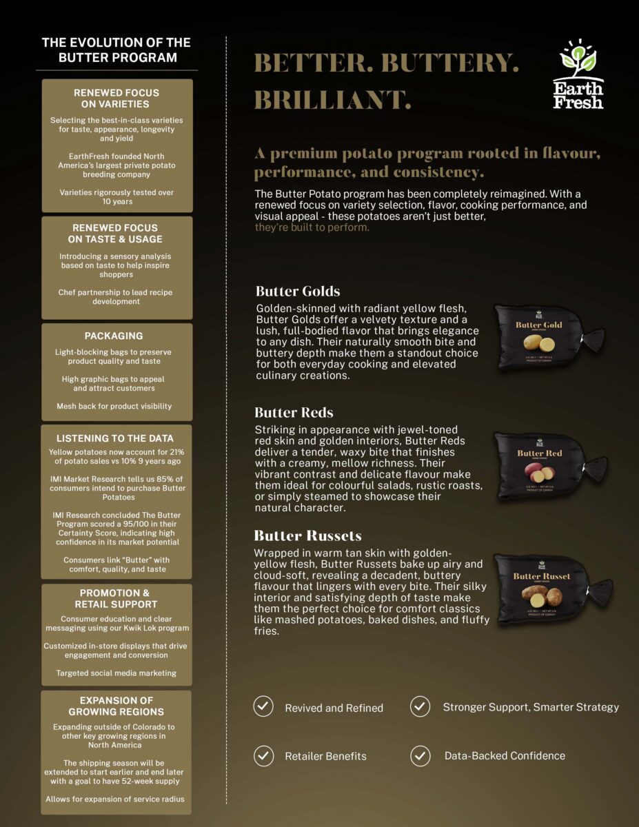 A premium potato program rooted in flavour, performance and consistency. The Butter Potato Program has been completely reimagined. With a renewed focus on variety selection, flavour, cooking performance, and visual appeal – these potatoes aren’t just better, they’re built to perform.