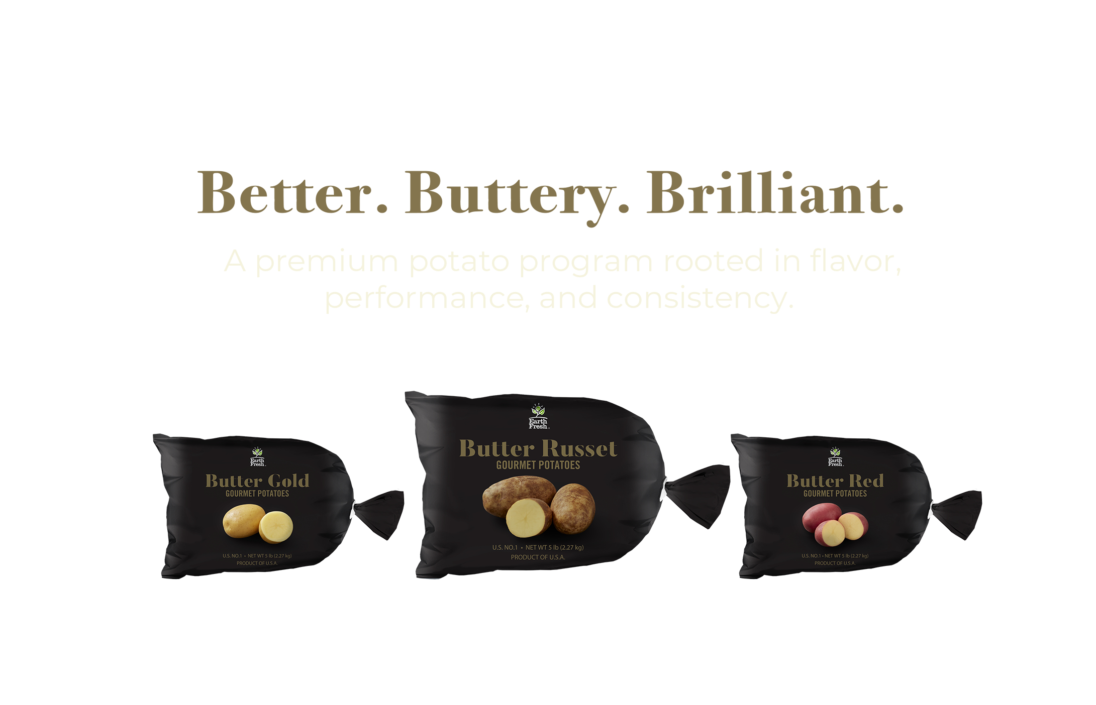 To that goal, we present the Butter Potato – A better, buttery and brilliant variety with remarkable texture and wonderful flavor. With Butter Red, Russet and Gold varietals, your mashed will be creamier, your roasted will be crispier outside and fluffier inside, and your potato salads will taste smoother and fresher.